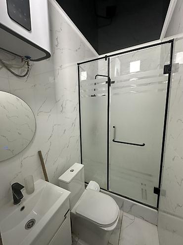 - Санузел совмещённый: душевой бокс с раздвижными матовыми стеклянными дверями, унитаз, тумба с раковиной и смесителем, круглое зеркало, водонагреватель.