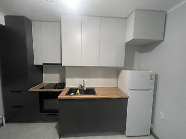 - Кухня в стиле минимализм: линейный гарнитур с верхними и нижними шкафами, деревянная столешница, мойка с высоким изливом, варочная поверхность газовая на 2 конфорки, духовой шкаф, холодильник.