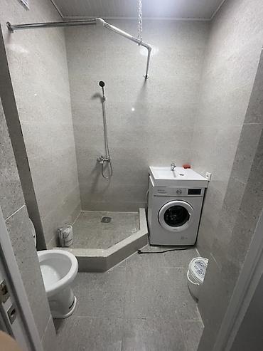 - Санузел совмещённый, облицован крупным керамогранитом; душевая зона с трапом и штангой под штору, унитаз, раковина, стиральная машина.