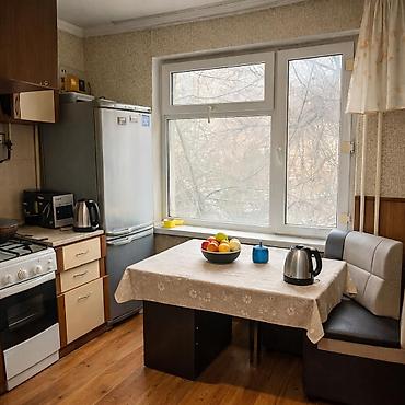 - Кухня светлая, с большим окном и обеденной зоной-уголком; установлены газовая плита с духовкой, холодильник, СВЧ‑печь, электрочайник, вытяжка.