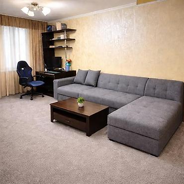 - Уютная двушка с функциональной планировкой: просторная гостиная с большим угловым диваном, рабочей зоной (стол, стеллажи) и журнальным столиком.