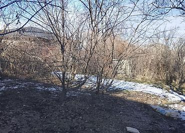 - Участок огорожен частично, растут взрослые деревья и кустарники.