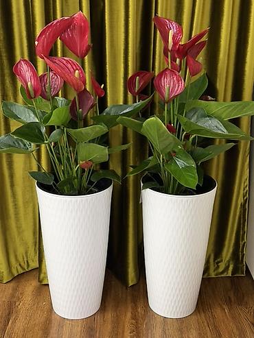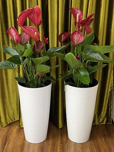 Крупномерные комнатные камелии (Camellia japonica) в декоративных кашпо - Вид: вечнозелёный куст/штамбовая форма с плотной кроной. - Цветы: крупные махровые, насыщенно‑красные, бутоны и раскрытые ...