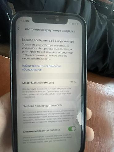 - Аккумулятор: в разделе «Состояние аккумулятора» отображается сообщение о необходимости обслуживания; максимальная ёмкость 77%; оптимизированная зарядка включена