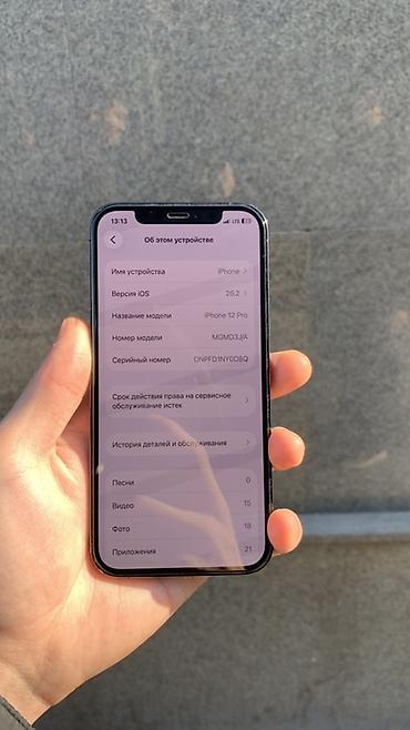 - Память: на экране видны установленные приложения/фото/видео; модель — iPhone 12 Pro, номер модели MGMD3J/A.