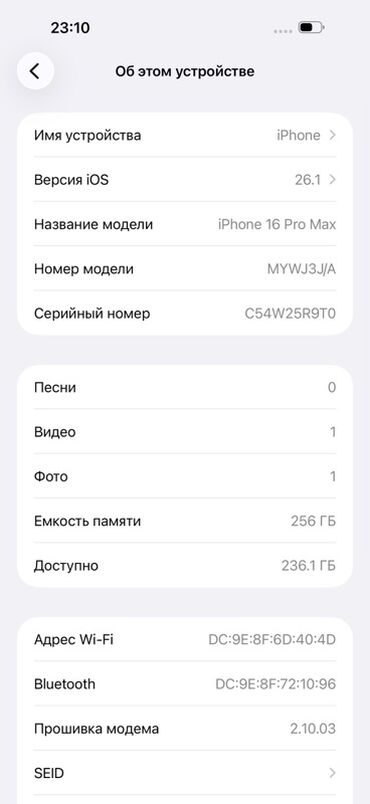 IPhone 15 Pro Max, титановый корпус (Natural Titanium), 256 ГБ. Характеристики по скриншотам: - Модель: iPhone 15 Pro Max (номер модели MU793AA/A). - Память: 256 ГБ, доступно ~237,7 ГБ. - iOS: 18....