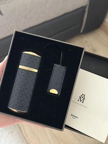 - Оригинальный подарок от MEMO Paris: элегантный флакон-атомайзер в чёрном кожаном чехле с тиснением и золотистыми акцентами + брелок-аксессуар в том же дизайне.