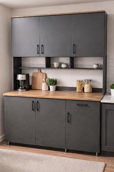 - Компактный модульный шкаф-буфет для кухни: нижний тумбовый блок с рабочей столешницей, открытая ниша с полкой и верхний навесной шкаф.