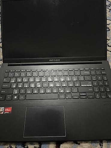 Ноутбук серии ASUS VivoBook в черном цвете. Полноразмерная клавиатура с цифровым блоком, русско‑английская раскладка. Большой тачпад, экран около 15–16 дюймов (тонкие рамки). На корпусе — фирменная наклейка серии VivoBook.