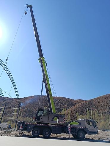Марка на стреле: Zoomlion. Модель: ZTC250V. Цвет: серо‑зелёный. На фото показаны работа со стрелой на вылете и транспортное положение на шасси.