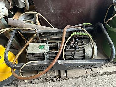 - Компрессорная/вакуумная установка в металлической раме: электрический двигатель с ременным/муфтовым приводом на компрессорный блок, шланги высокого/низкого давления, штуцера, манометры/фитинги на выходе.