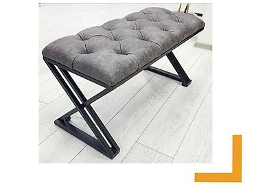 - Банкетка в стиле лофт: мягкое сиденье с объемной каретной стяжкой, обивка из износостойкой ткани серого цвета. Основание — металлическая рама с дизайнерскими Z-образными ножками. Подходит для прихожей, спальни, гардеробной, зоны ожидания; выдерживает высокие нагрузки, не шатается, не пачкает пол, защищенные опоры.