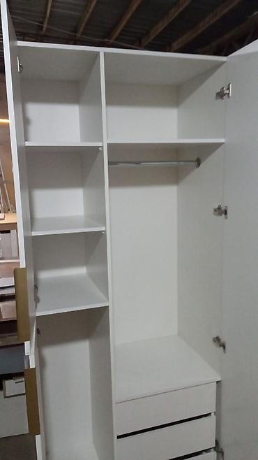 - Внутри шкафа: секция с полками, секция с штангой для вешалок, встроенный блок из трех выдвижных ящиков.