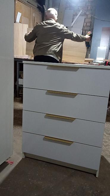 - Отдельно стоящий комод на 4 выдвижных ящика с горизонтальными золотистыми ручками в тон шкафу.