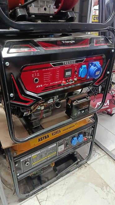 Дополнительно на фото виден бензогенератор Astra Korea EG6500 (gasoline generator) с аналогичной панелью управления, вольтметром, автоматом защиты, двумя розетками AC и ручным/электростартером.