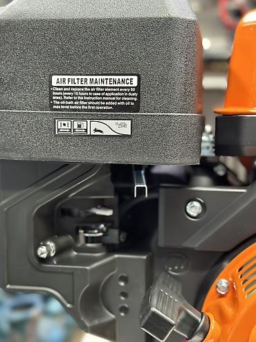 - Воздушный фильтр с масляной ванной; на корпусе напоминание по обслуживанию (чистка/замена каждые 50 ч, в пыльных условиях — каждые 10 ч)