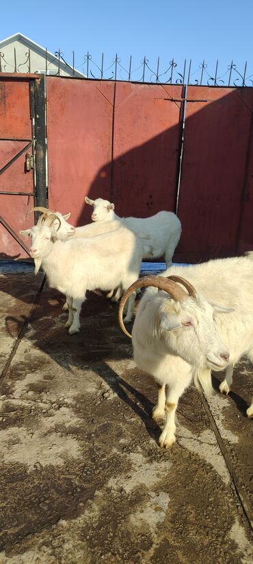 Козёл-производитель, зааненский, белый, рогатый, с бородой и густой длинной шерстью. На фото — крепкое, крупное животное с правильной постановкой ног и широким корпусом. Окрас однородный светлый, н...