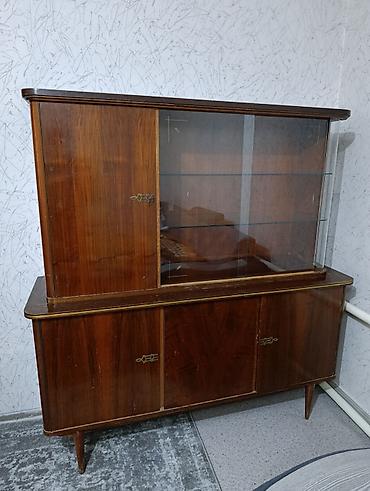 Витрина-буфет советского образца - Материал: шпон дерева, стеклянные раздвижные дверцы в верхней части, боковые и центральные стеклянные полки. - Конструкция: двухсекционная. - Верх: застекленна...