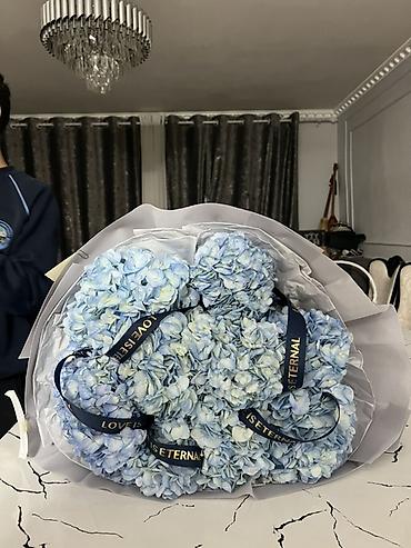 - Состав: крупные соцветия гортензии нежно‑голубого оттенка.