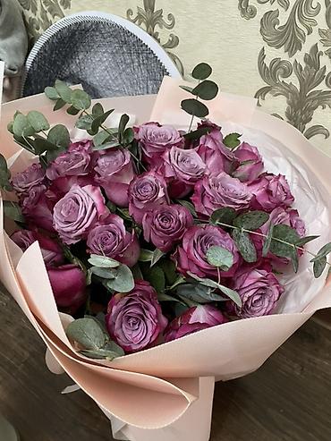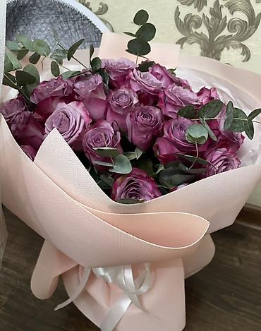 - Состав: крупные розы оттенков сиренево‑розовой гаммы, свежая зелень эвкалипта.