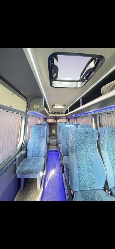 Пассажирский микроавтобус Mercedes‑Benz Sprinter (длинная база, высокий потолок), двухтональная окраска бело‑голубая. Основные особенности: - Планировка салона под маршрут/шаттл: широкая сдвижная ...