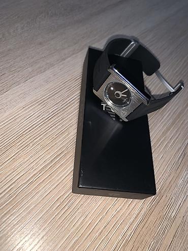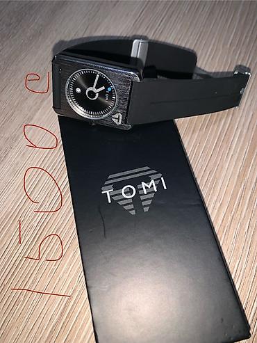 - Черный циферблат с минутной разметкой и стрелками; логотип TOMI