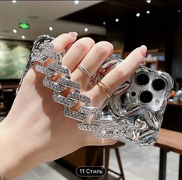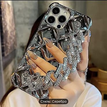 Блестящий чехол для смартфона с объёмной зеркальной фактурой и декоративной цепью со стразами.