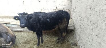 Бык-производитель, чёрно-пёстрый окрас. Крупный, сильный, с широкой грудью и хорошо развитыми мышцами. Содержится в крытом загоне, на привязи, с кормушкой для сена. На фото — реальное животное, спо...