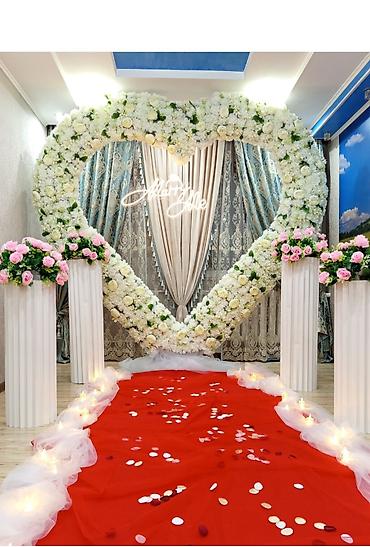 - Большая объемная арка-сердце, оформленная белыми цветами.