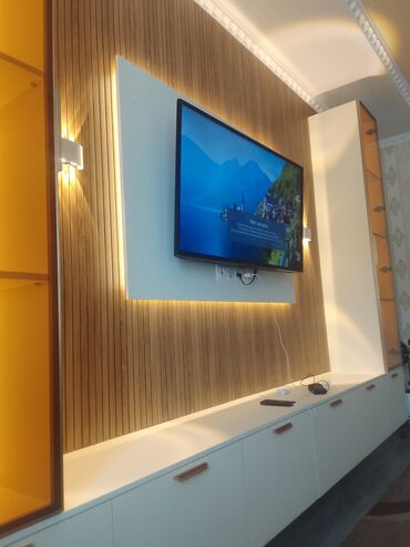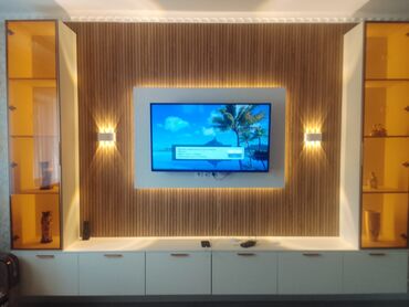 - ТВ-зоны и акцентные стены с подсветкой: интеграция креплений под телевизор, скрытие проводов, световые ниши.