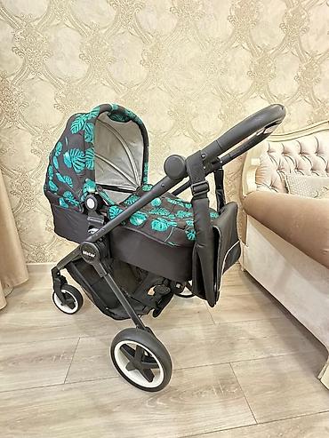 Комплектация по фото: рама, люлька, прогулочный блок, матрас/вкладыш, сумка для мамы, корзина. Цвет: чёрный с бирюзовым принтом. Подходит с рождения и до toddler-возраста.