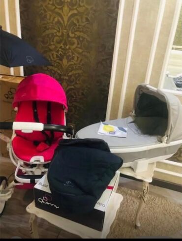 - Комплектация: прогулочный блок с капюшоном (ярко‑розовый текстиль), люлька для новорождённого (серая), утеплительный конверт/чехол для ног Quinny, корзина для покупок, бампер‑перекладина, инструкция. На фото также виден фирменный короб Quinny.