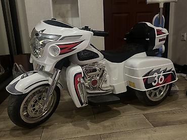 Детский электрический мотоцикл (стиль “турер”), белый с красно‑чёрными наклейками «36».