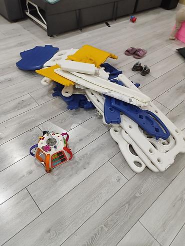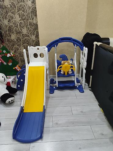 - Компактный домашний игровой набор для малышей: горка и качели в одном.