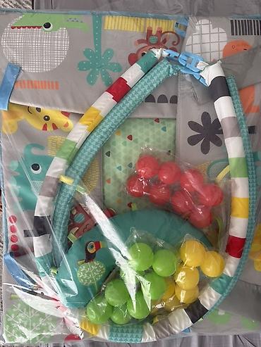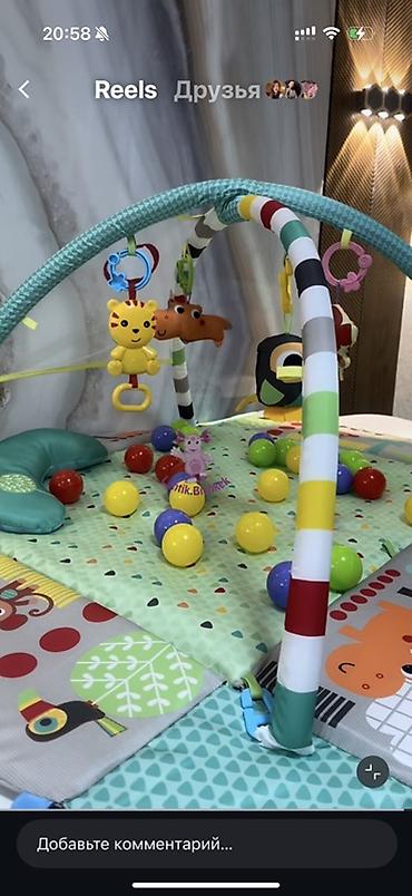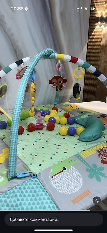 - Комплект на фото: коврик, 2 дуги, подушка, подвесные игрушки, набор разноцветных шариков. Цвета и рисунки как на изображениях.