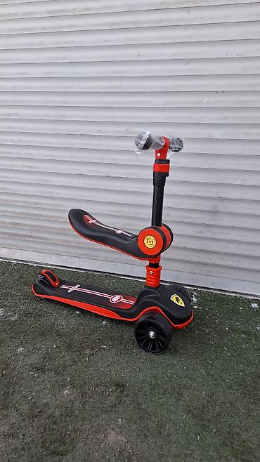 - Модель в чёрно‑красном цвете с откидным сиденьем: можно кататься стоя или сидя; компактная платформа и широкий задний тормоз