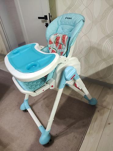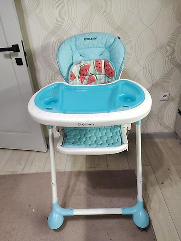 Отлично подходит с начала прикорма и «растёт» вместе с ребёнком за счёт регулировок. Цвет: нежно-голубой с белым, яркая столешница. Брендинг Olsson/All in One на спинке и ножке.