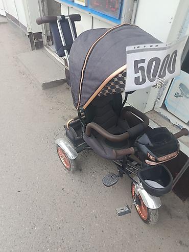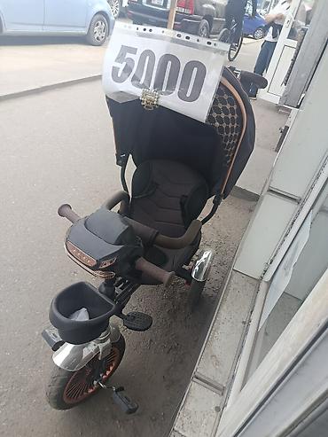 Детский трехколесный велосипед-коляска с родительской ручкой и капюшоном.
