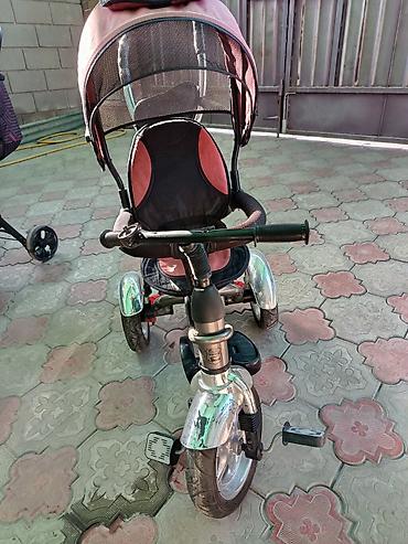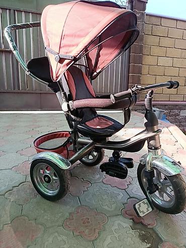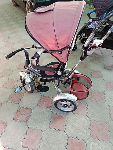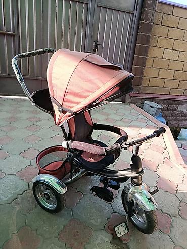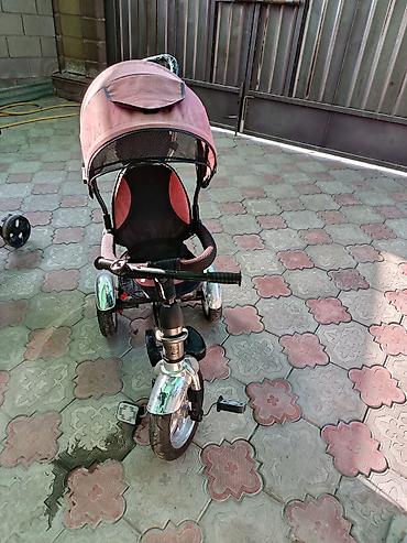 Детский трехколесный велосипед-коляска с родительской ручкой и капюшоном.