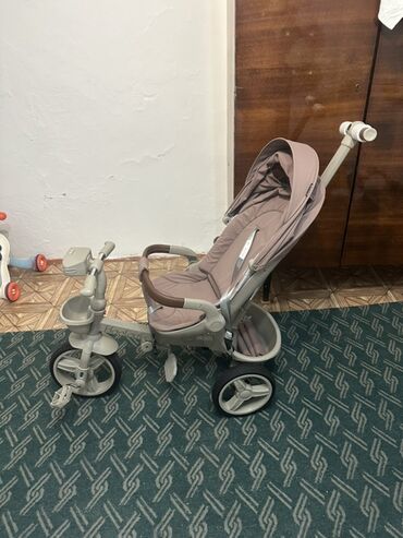 - Формат 2-в-1: прогулочный модуль с высоким сиденьем и ограничительным бампером + трицикл с педалями спереди.