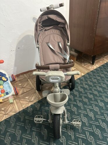 Детский трехколесный велосипед-трансформер с родительской ручкой и капюшоном.