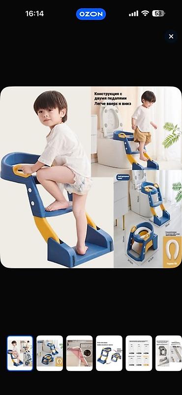 - Универсальная насадка на унитаз со ступенькой и боковыми поручнями для самостоятельного использования туалета ребенком.