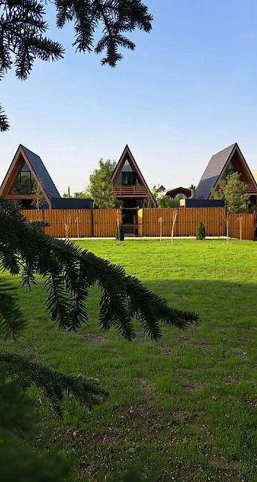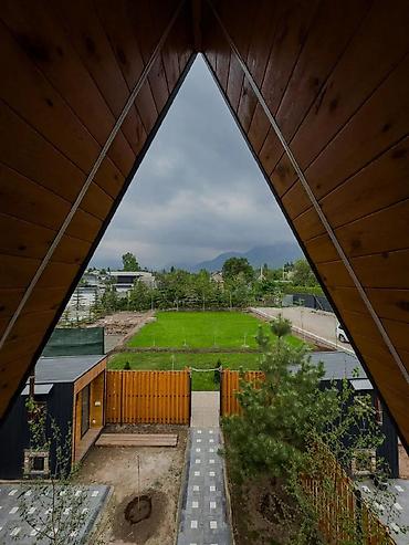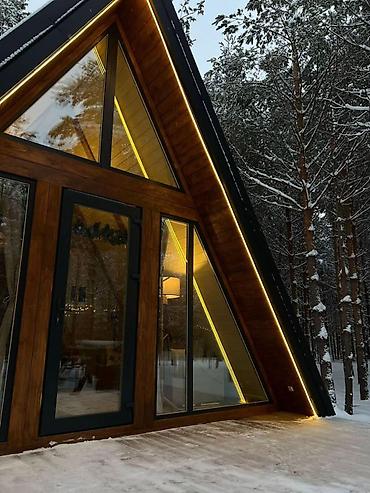 - Архитектура: деревянные дома формата A-frame с панорамными фронтонными окнами, верандой/балконом и металлической кровлей.