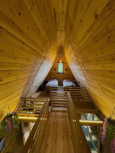 - Планировка: двухуровневое пространство с антресолью; на втором уровне — спальня с двумя раздельными кроватями, качественная деревянная отделка, природное освещение.