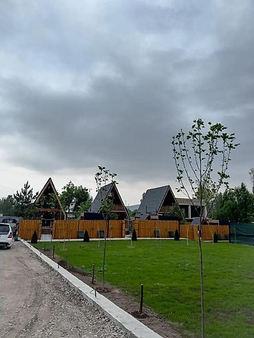 - Участок: зелёные газоны, молодые деревья, хвойные посадки, собственные ограждённые дворики для каждого домика, дорожки и подъезд.