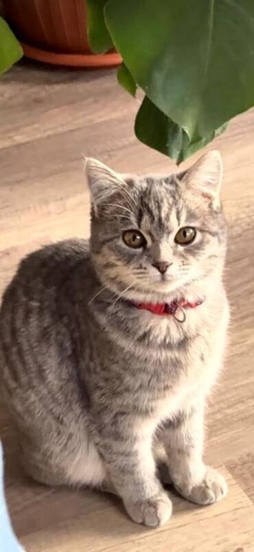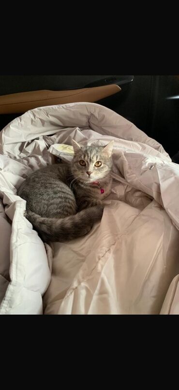 Кошка домашняя, серо-полосатая (табби), компактного телосложения. Короткая плотная шерсть с мягким подшерстком, выразительные янтарные глаза. Аккуратные уши, округлая мордочка. На шее — красный ошейник с колокольчиком. Спокойный, ручной характер: любит сидеть рядом, хорошо переносит поездки (на фото — в машине на пледе). Подходит для квартиры: привыкает к лотку, уживчива с растениями и бытовой обстановкой. Отлично чувствует себя в роли компаньона, охотно играет с веревочками и мягкими игрушками, любит уютные лежанки и пледы. Требует стандартного ухода: расчесывание 1–2 раза в неделю, качественный корм, чистка лотка, контроль когтей и профилактика паразитов.