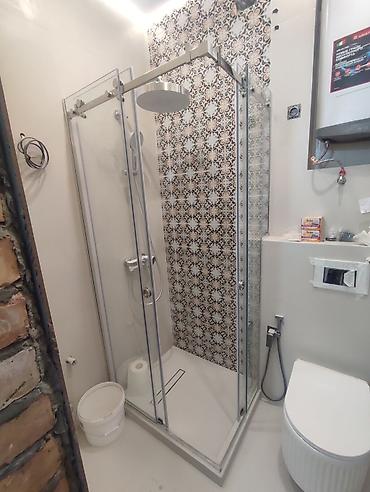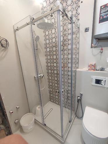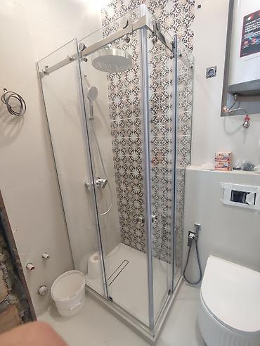 Душевая кабина со стеклянными раздвижными дверями и верхним тропическим душем а также устанавливаем зеркало с подсветкой зеркальное пано ( мозайки) офисные перегородки итд замер бесплатно с Вами команда Elite glass