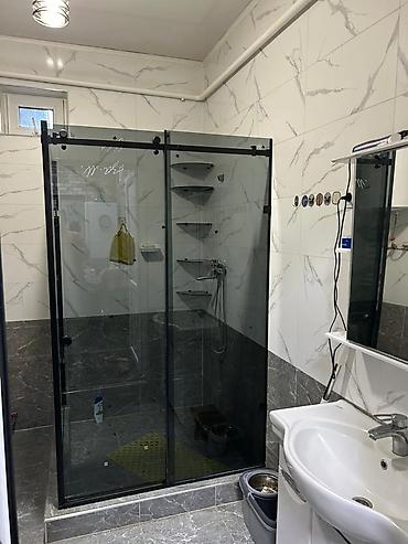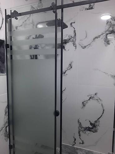 - Конструкция: стационарные стеклянные панели + раздвижные двери на верхней направляющей с роликами.