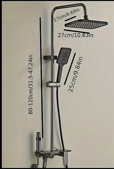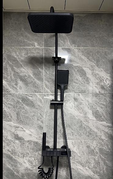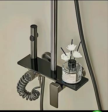 - Комплектация: верхний тропический душ квадратной формы, ручная лейка, нижний излив/кран, гигиенический ручной душ-распылитель (цилиндрический), стойка с регулируемым держателем, полка-органайзер для аксессуаров, гибкие шланги (в т.ч. спиральный для распылителя), термостатический смеситель с панелью управления.