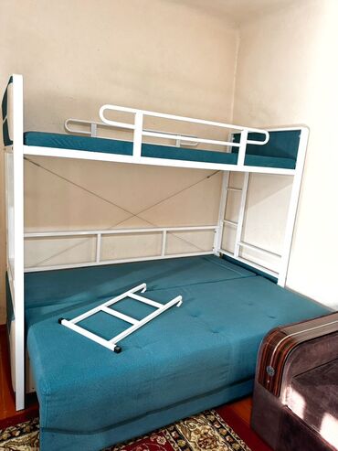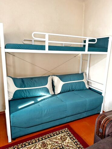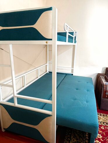 Двухъярусная кровать-трансформер с диваном и выкатным нижним спальным местом. Основные особенности: - Конструкция из металлического каркаса белого цвета с двумя боковыми лестницами. - Верхний ярус...